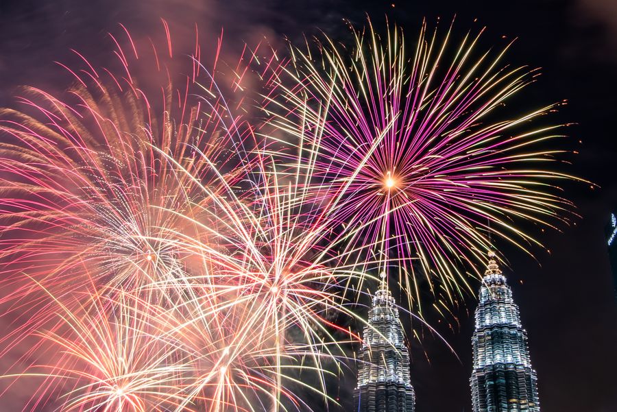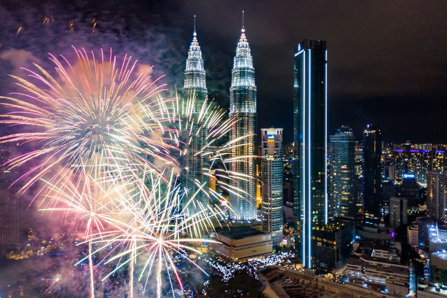 Photo taken on Dec. 31, 2019, shows people celebrate the New Year near the Petronas Twin Towers in Kuala Lumpur, Malaysia. (Xinhua/Chong Voon Chung) ■