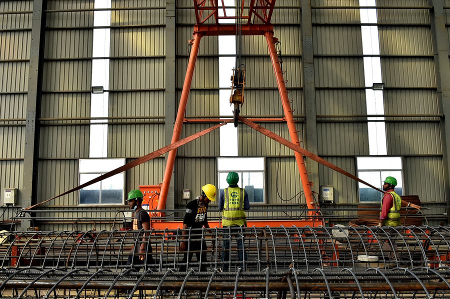 Laborers work in the plant where the box girders of elevated railway of Padma Bridge Rail Link Project are manufactured at Keraniganj on the outskirts of capital Dhaka, Bangladesh, Dec. 31, 2019. (Str/Xinhua)