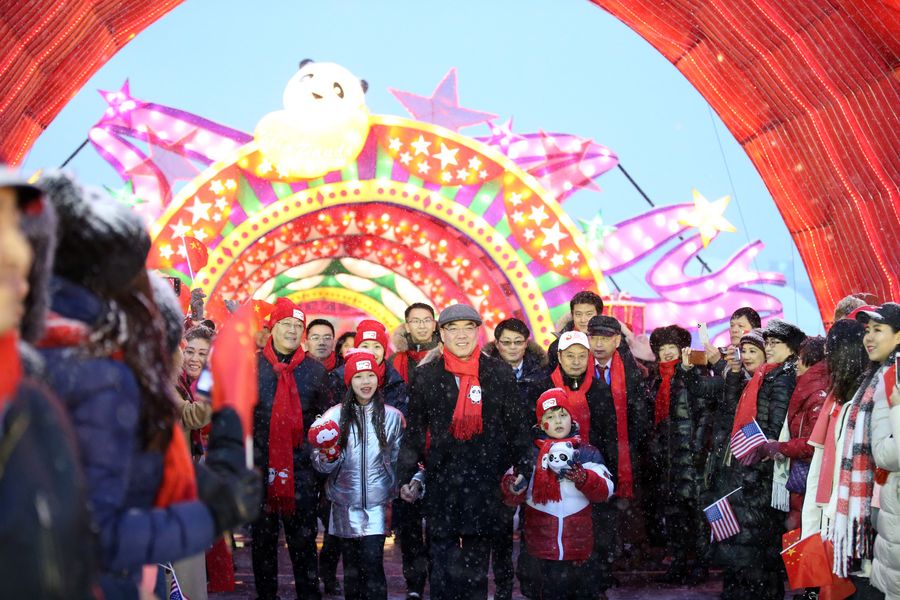 In heavy snow fall, Huang Ping, the Chinese consul general in New York, stood in the front of the cheering crowd, holding the hands of Bing Dwen Dwen, the mascot of the Beijing Winter Olympics, and Shuey Rhon Rhon, the mascot of the Beijing Winter Paralympics.