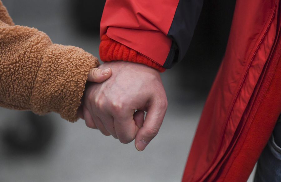 Jiang Lei (R), a doctor from the First Affiliated Hospital of Chongqing Medical University, holds his fiancee Gao Jia's hand at Chongqing Jiangbei International Airport in southwest China's Chongqing, Jan. 26, 2020. A team comprised of more than 130 medical workers from Chongqing left for Xiaogan City of Hubei Province to aid the novel coronavirus control efforts. (Xinhua/Wang Quanchao)
