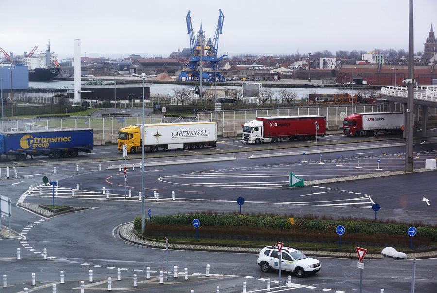 Trucks wait to embark a ferry to Britain at the Calais Port in France on Jan. 31, 2020. (Xinhua/Gao Jing)