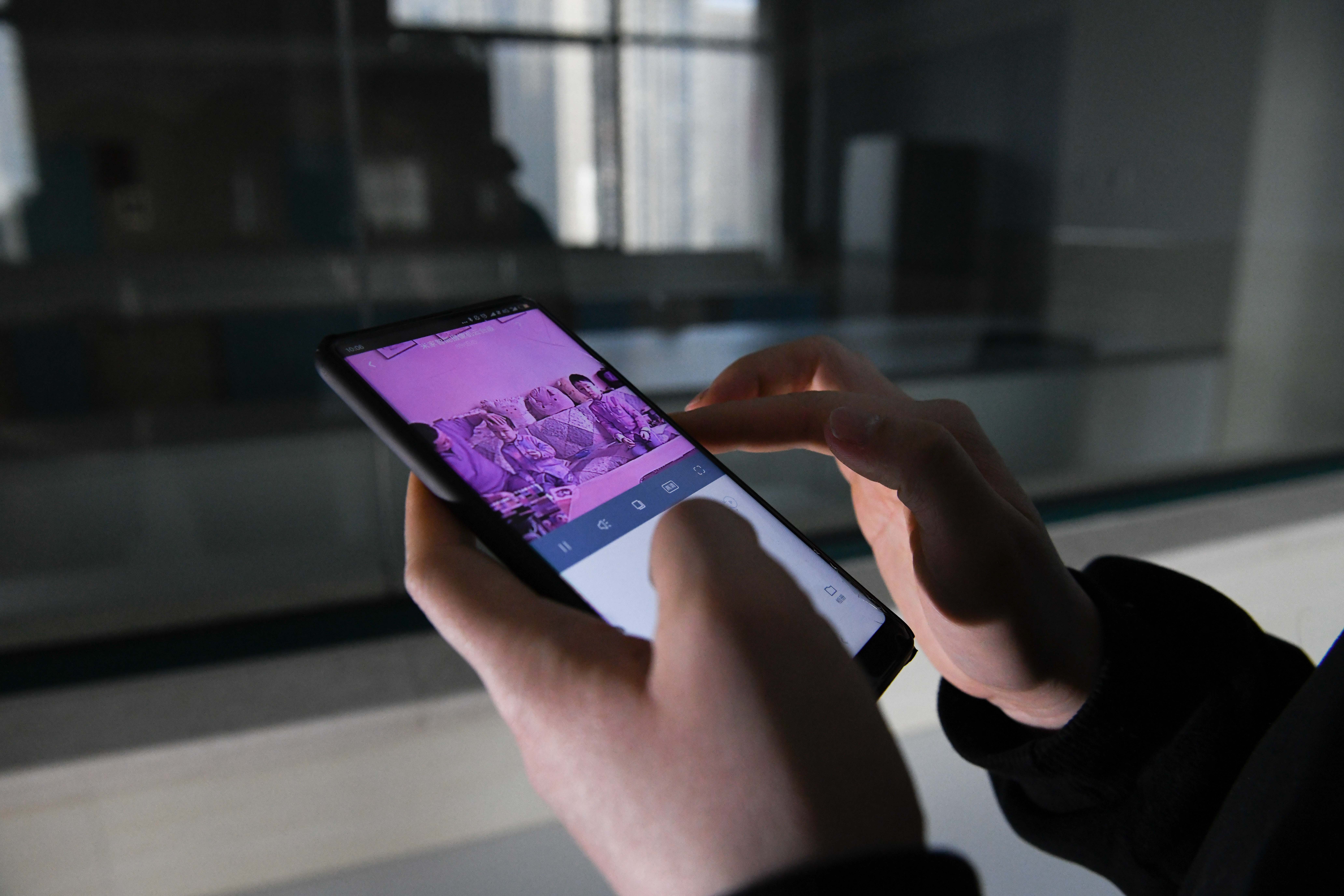 Fang Ji, a nurse, watches her sons through the monitoring camera of home by her cellphone, in the Second People's Hospital of Hefei in Hefei, capital of east China's Anhui Province, Feb. 3, 2020. (Xinhua/Zhang Duan)