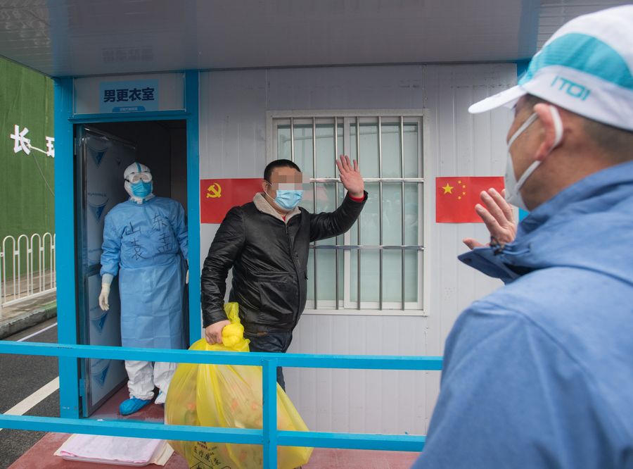 A recovered patient infected with novel coronavirus pneumonia (NCP) waves to medical staff at a temporary hospital in Wuhan, central China's Hubei Province, Feb. 21, 2020. (Xinhua/Xiao Yijiu)