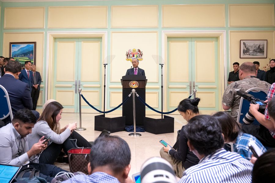Malaysia's interim Prime Minister Mahathir Mohamad speaks at a press conference at the prime minister's office in Putrajaya, Malaysia, Feb. 27, 2020. (Xinhua/Zhu Wei)