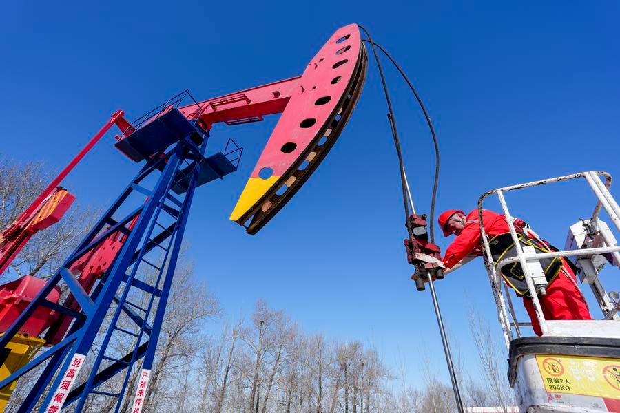 A worker maintains a pumpjack at Daqing Oilfield in Daqing, northeast China's Heilongjiang Province, March 6, 2026. (Xinhua/Wang Song)