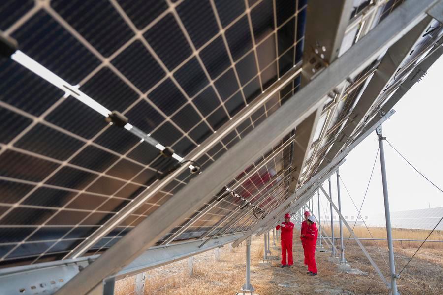 Technicians inspect the photovoltaic power generation equipment at the low-carbon demonstration zone of Lamadian Oilfield in Daqing, northeast China's Heilongjiang Province, March 25, 2026. (Xinhua/Wang Song)