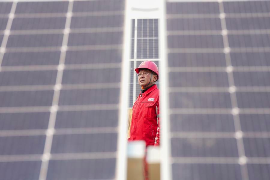 A technician inspects the photovoltaic power generation equipment at the low-carbon demonstration zone of Lamadian Oilfield in Daqing, northeast China's Heilongjiang Province, March 25, 2026. (Xinhua/Wang Song)