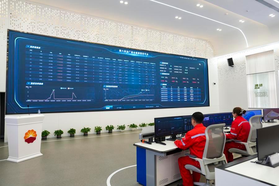 Staff members monitor the operation data of new energy equipment at the intelligent command center of Lamadian Oilfield in Daqing, northeast China's Heilongjiang Province, March 25, 2026. (Xinhua/Wang Song)