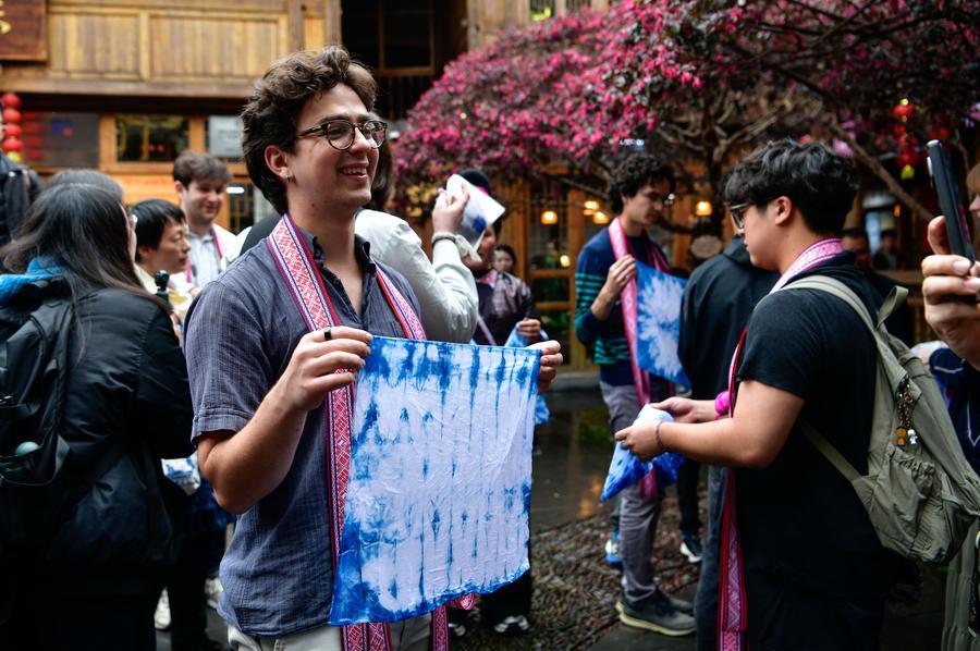 A member of the Whiffenpoofs, a cappella choir of Yale University, shows his batik work at Zhaoxing Dong Village of Liping County, southwest China's Guizhou Province, March 23, 2026. (Xinhua/Yang Wenbin)