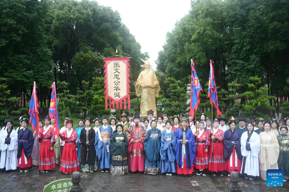 People pose for a group photo during a Hanfu parade marking the 500th anniversary of Zhang Juzheng's birth at Zhang Juzheng's cemetery in Jingzhou, central China's Hubei Province, May 31, 2025. (Xinhua)