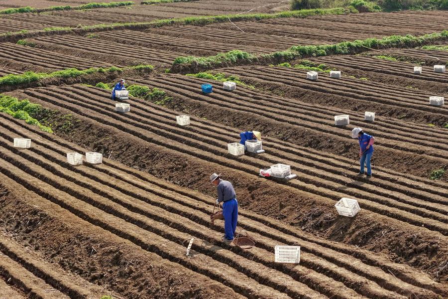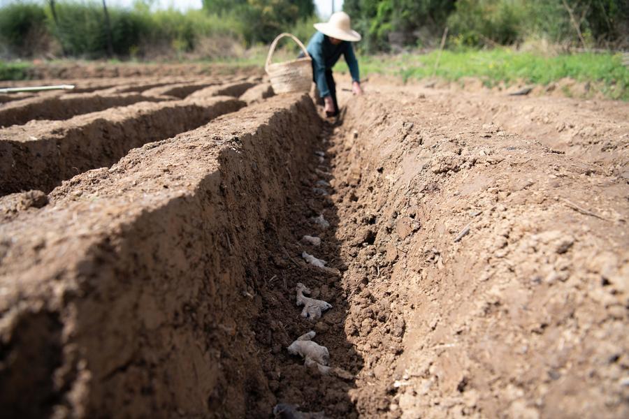 TONGLING, April 6 (Xinhua) -- Around the Qingming Festival, farmers in Tongling are busy ridging fields, planting white ginger, applying fertilizer, and building ginger sheds.