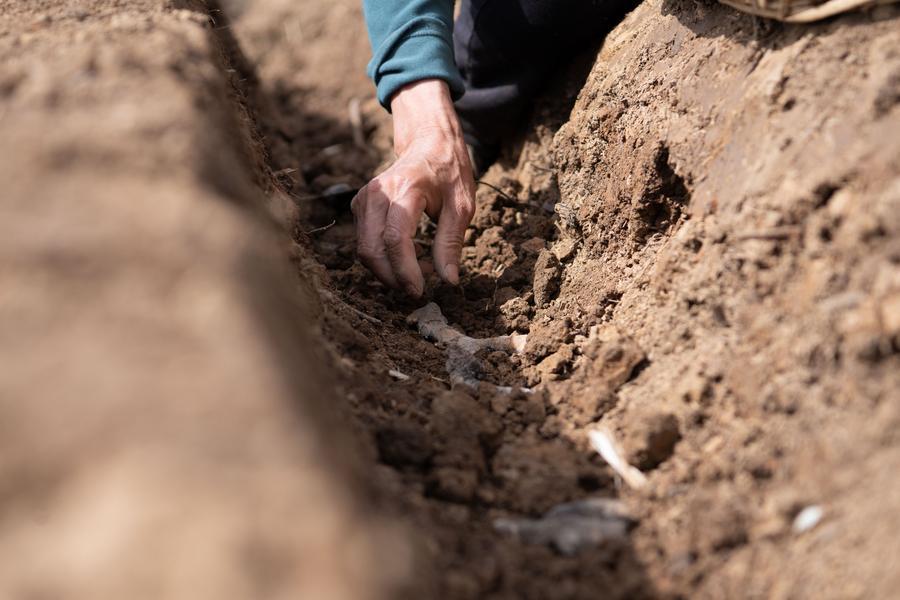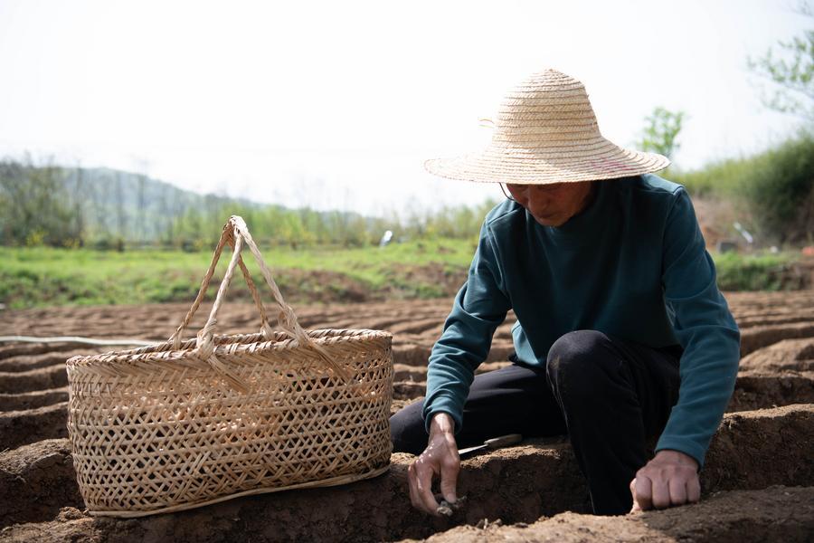 A farmer plants white gingers in a field in Datong Town of Tongling, east China's Anhui Province, on April 5, 2026. (Xinhua/Zhang Duan)