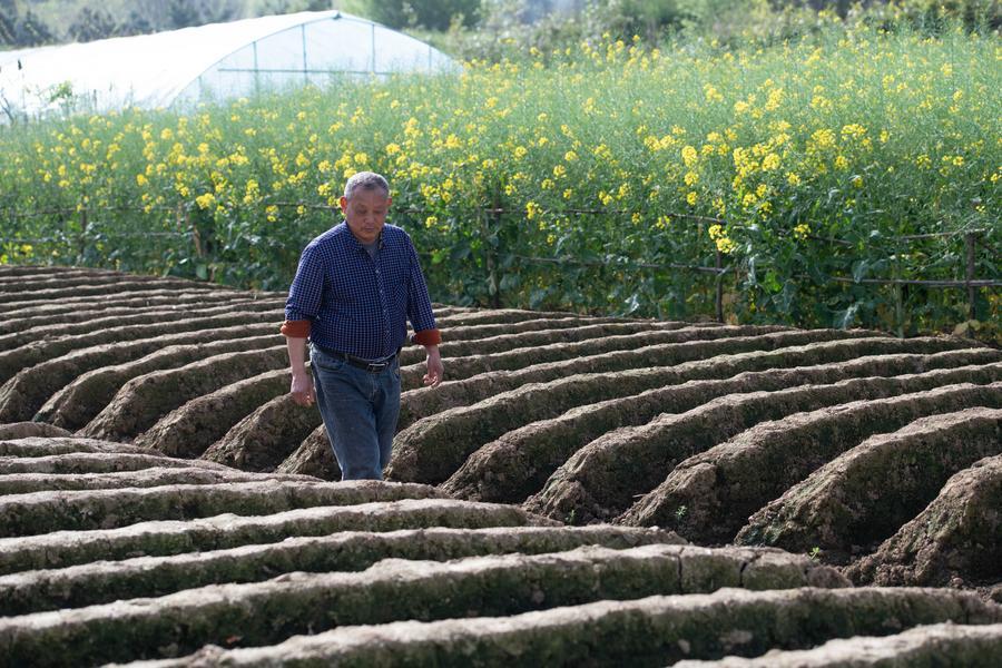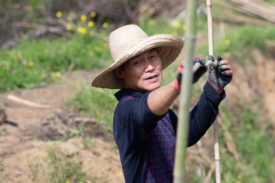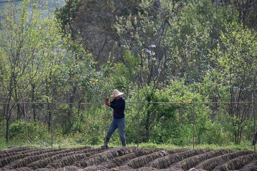 A farmer builds ginger sheds in a field in Datong Town of Tongling, east China's Anhui Province, on April 5, 2026. (Xinhua/Zhang Duan)