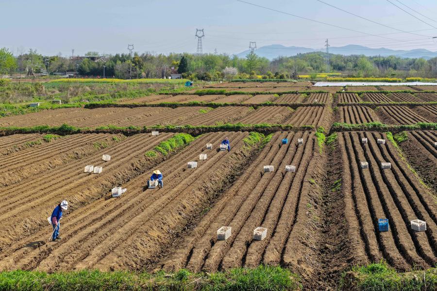 A drone photo taken on April 2, 2026 shows farmers working in the fields in Tianmen Town of Tongling, east China's Anhui Province. (Photo by Chu Zhuchuan/Xinhua)■