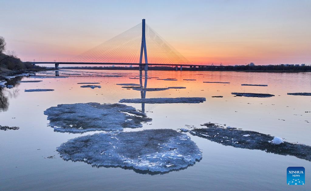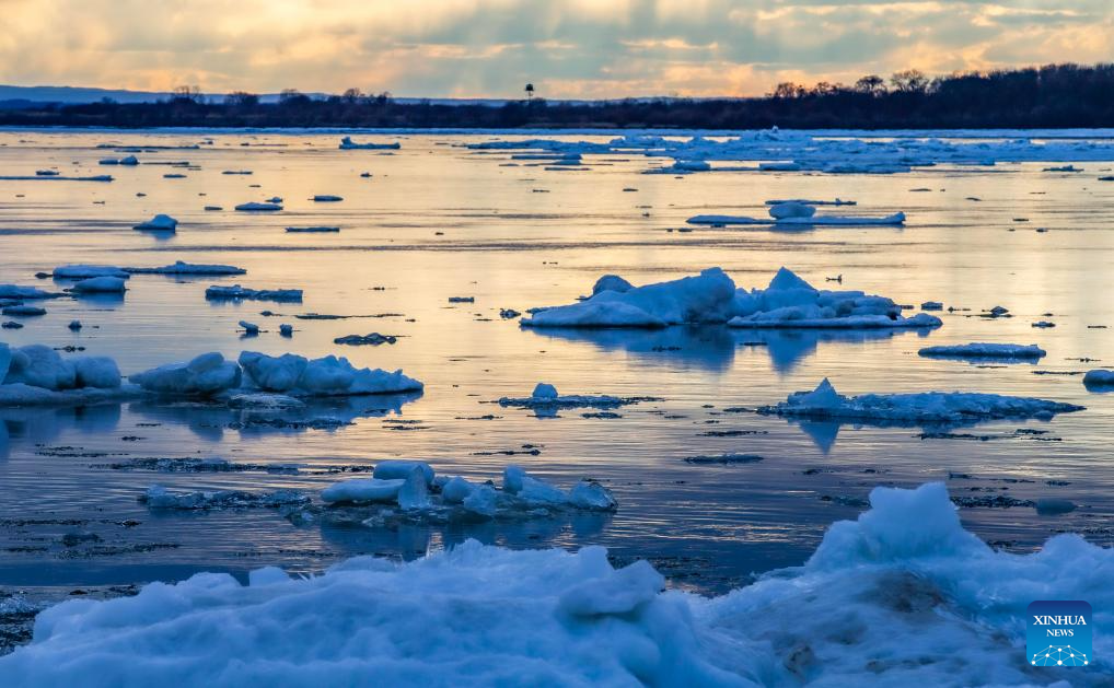 This photo taken on April 14, 2026 shows a view of drift ice floating on the Jiayin section of Heilongjiang River at sunrise in northeast China's Heilongjiang Province. Large amount of ice drifted on the surface of Heilongjiang River and Songhua River recently due to the rise of temperature. (Photo by Li Shaojun/Xinhua)