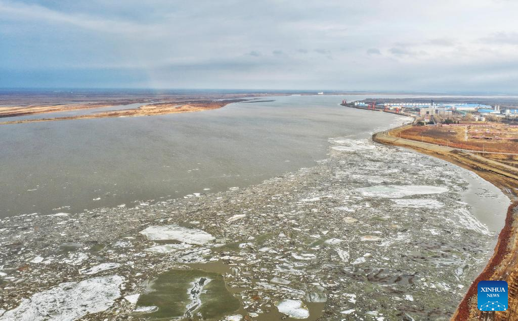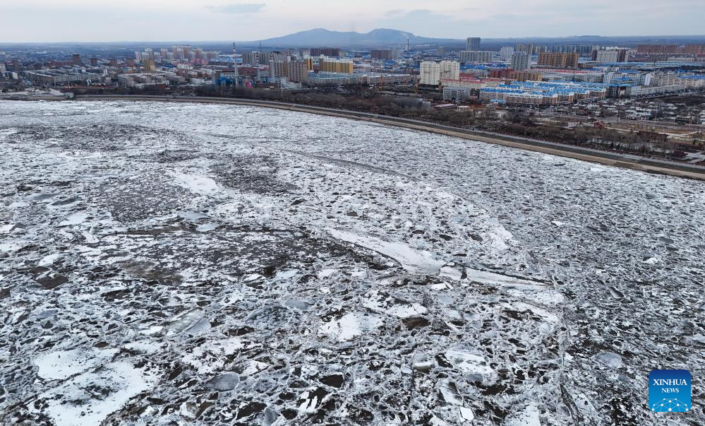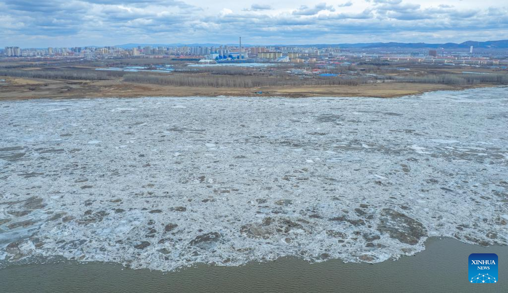 This photo taken on Apirl 13, 2026 shows a view of drift ice floating on the Jiayin section of Heilongjiang River in northeast China's Heilongjiang Province. Large amount of ice drifted on the surface of Heilongjiang River and Songhua River recently due to the rise of temperature. (Photo by Li Shaojun/Xinhua)