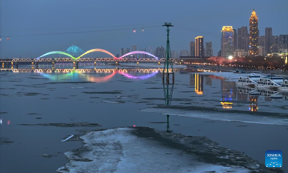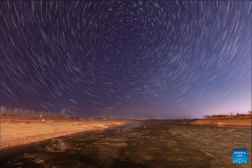 This stacked photo taken on April 14, 2026 shows a view of drift ice floating on the Harbin section of Songhua River under the starry sky in northeast China's Heilongjiang Province. Large amount of ice drifted on the surface of Heilongjiang River and Songhua River recently due to the rise of temperature. (Photo by Liu Dapeng/Xinhua)