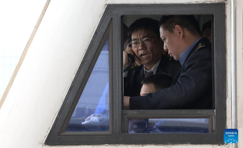 Railway staff members work on a test train which is about to depart from Xiong'an Railway Station in the Xiong'an New Area, north China's Hebei Province, April 15, 2026. The Hebei section of the Xiong'an-Shangqiu High-speed Railway kicked off its coordinated debugging and test on Wednesday.