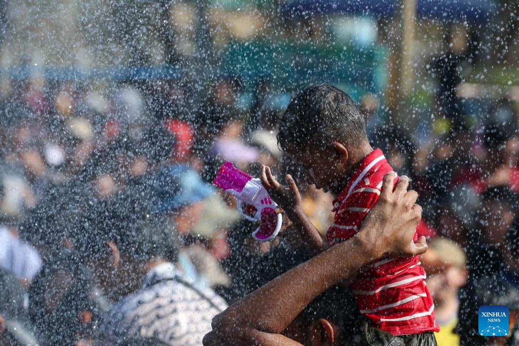 A child plays with a toy water gun during the Thingyan water festival in Yangon, Myanmar, April 14, 2026. (Xinhua/Myo Kyaw Soe)