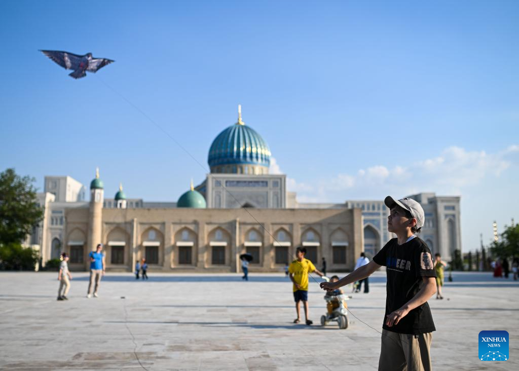 A child flies a kite on a square in Tashkent, Uzbekistan, April 12, 2026. (Xinhua/Li Renzi)
