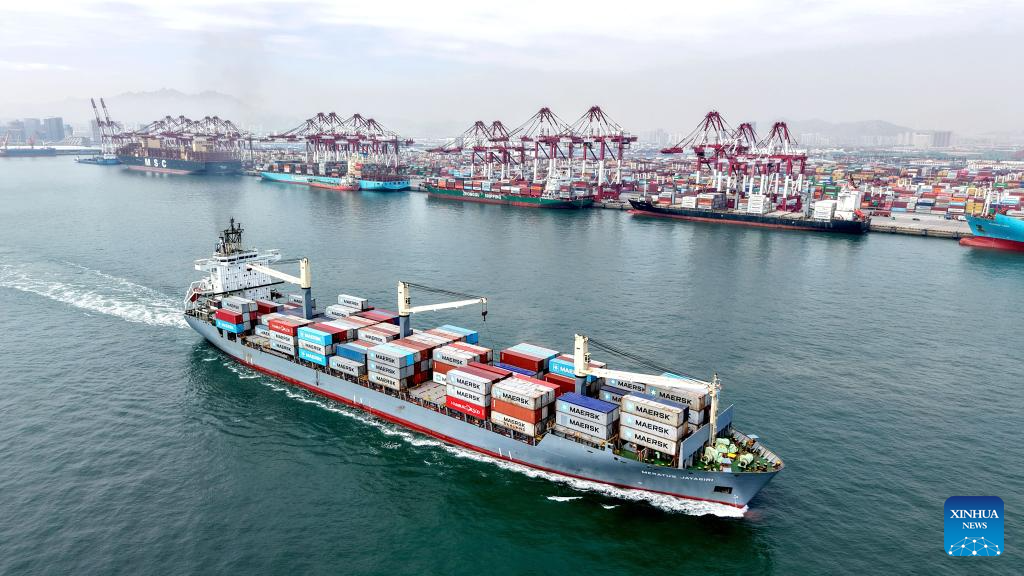 A drone photo taken on April 14, 2026 shows a cargo ship with containers leaving Qingdao Port in east China's Shandong Province. China's foreign trade grew 15 percent year on year in the first quarter (Q1) of 2026, data from the General Administration of Customs showed on Tuesday.