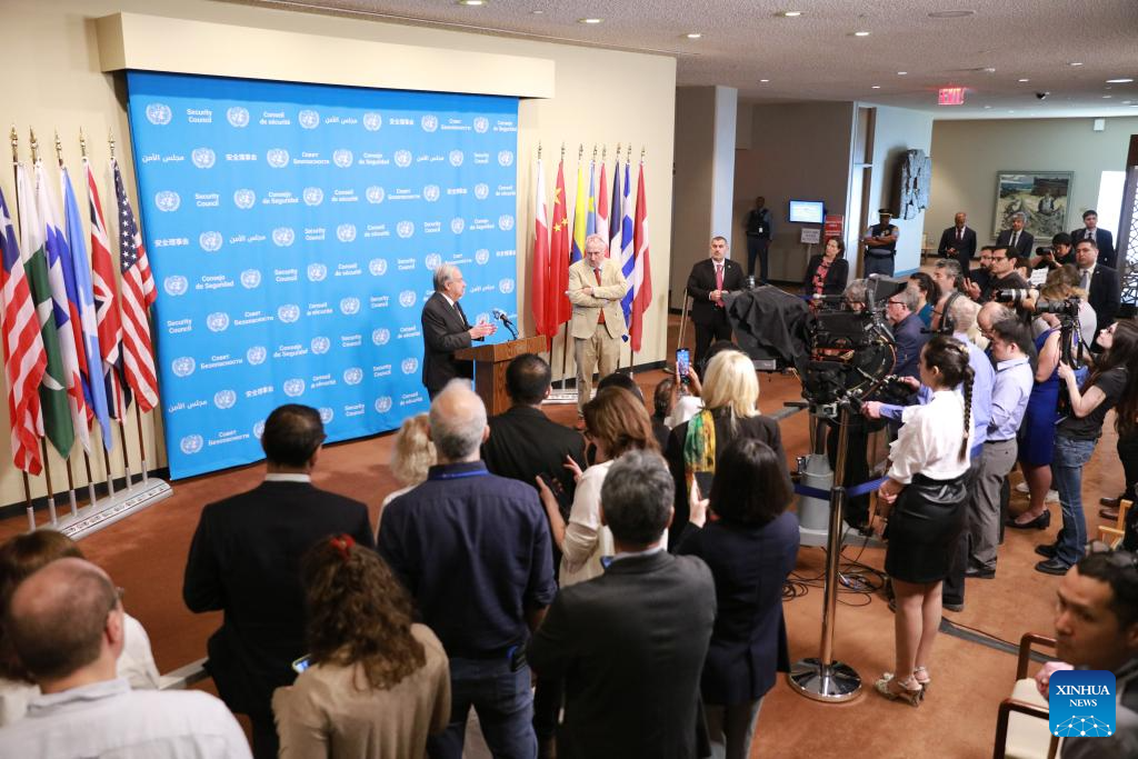 UN Secretary-General Antonio Guterres (L) speaks to the press at the UN headquarters in New York, April 14, 2026. Guterres said Tuesday that the resumption of talks between Washington and Tehran is highly probable. (Xinhua/Xie E)