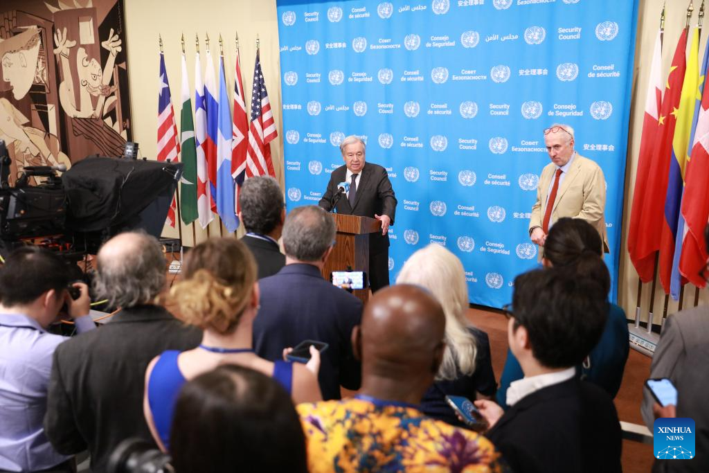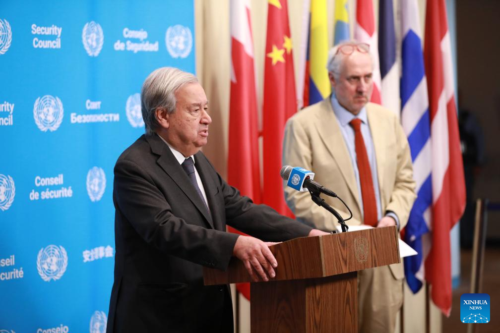 UN Secretary-General Antonio Guterres speaks to the press at the UN headquarters in New York, April 14, 2026. Guterres said Tuesday that the resumption of talks between Washington and Tehran is highly probable. (Xinhua/Xie E)