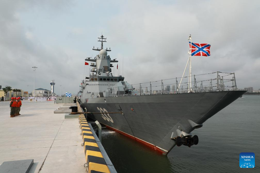 A frigate of a Russian navy fleet arrives at a military port in Zhanjiang, south China's Guangdong Province, April 15, 2026. A Russian navy fleet consisting of two frigates and a medium-sized replenishment ship arrived in south China's Guangdong Province on Wednesday for a five-day friendly visit.