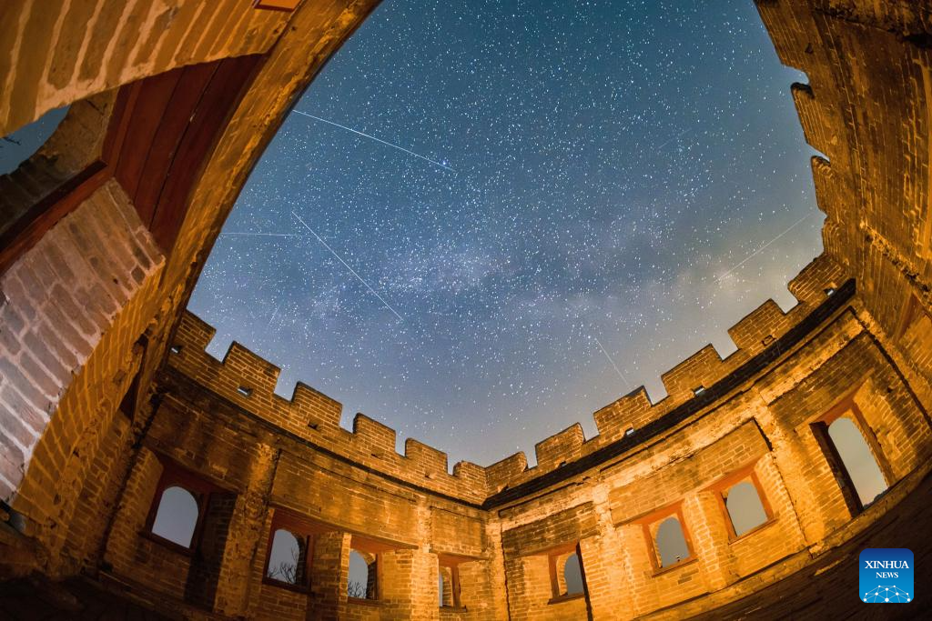 This photo taken on April 15, 2026 shows a view of the starry sky above the Jinshanling section of the Great Wall in Chengde City, north China's Hebei Province. (Xinhua/Xing Guangli)