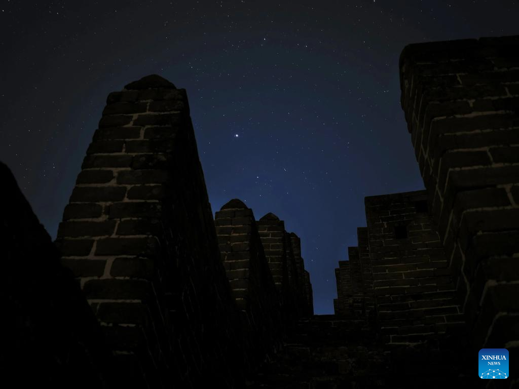 This photo taken on April 15, 2026 shows a view of the starry sky above the Jinshanling section of the Great Wall in Chengde City, north China's Hebei Province. (Photo by Wang Junfeng/Xinhua)