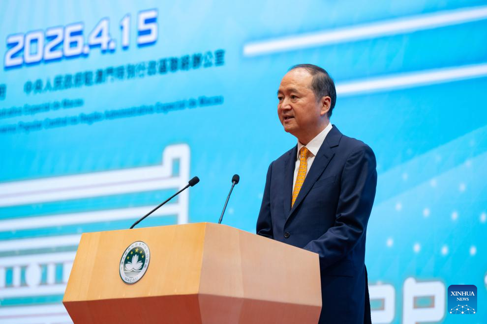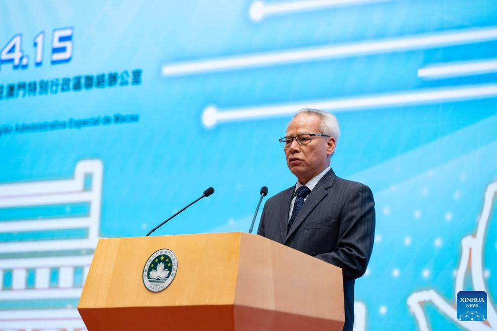 Sam Hou Fai, chief executive of China's Macao Special Administrative Region (SAR), addresses the opening ceremony of a series of national security education activities in Macao, south China, April 15, 2026. (Xinhua/Cheong Kam Ka)