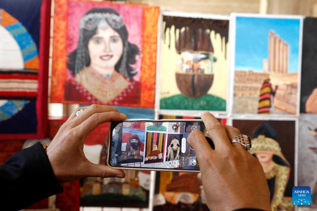 A man takes photos of paintings during an art exhibition in Sanaa, Yemen, on April 14, 2026. A one-day art exhibition was launched on Tuesday in Yemen's capital Sanaa. The show featured hundreds of paintings by around 150 local artists highlighting the country's rich heritage, culture, and history. (Photo by Mohammed Mohammed/Xinhua)