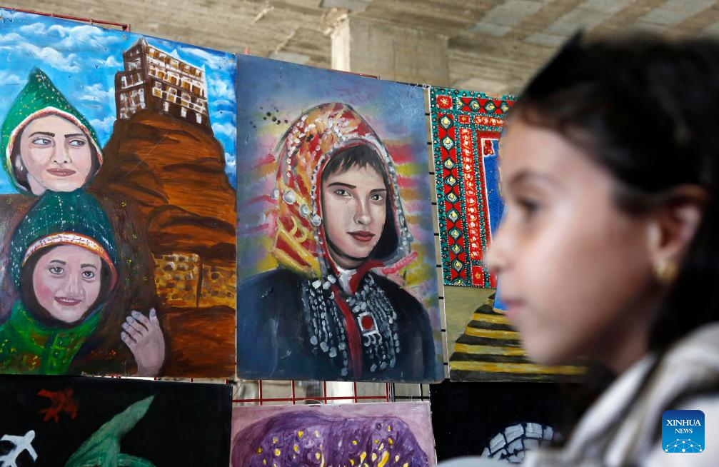 A girl views paintings during an art exhibition in Sanaa, Yemen, on April 14, 2026. A one-day art exhibition was launched on Tuesday in Yemen's capital Sanaa. The show featured hundreds of paintings by around 150 local artists highlighting the country's rich heritage, culture, and history. (Photo by Mohammed Mohammed/Xinhua)