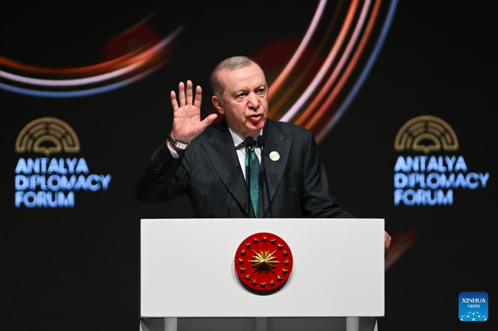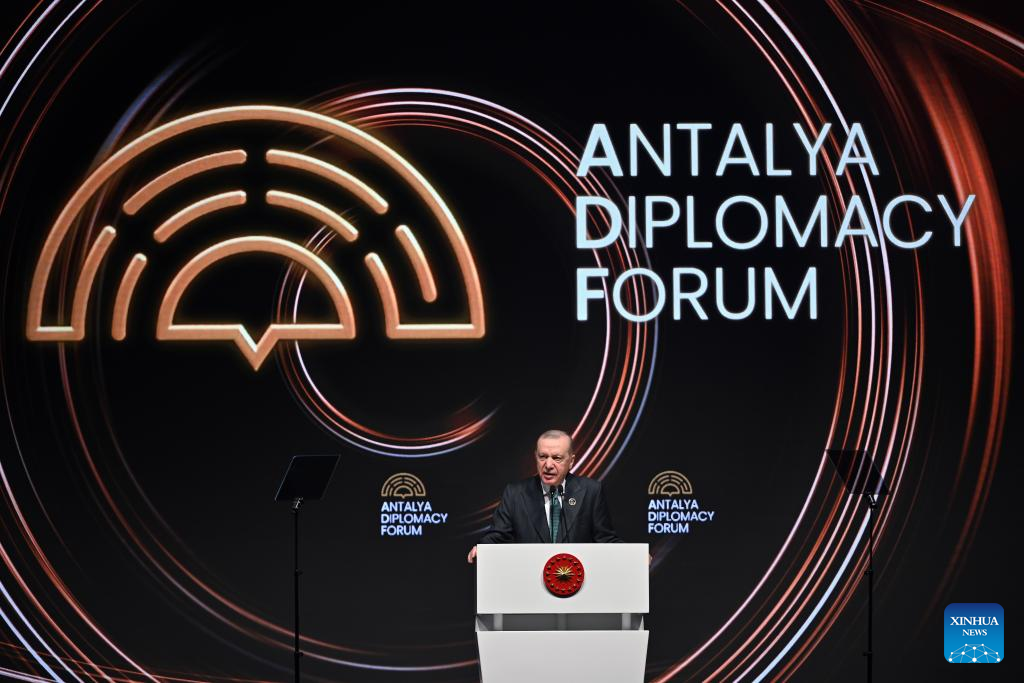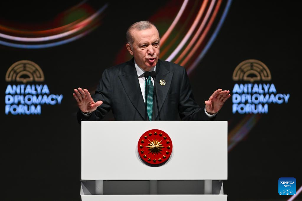 Turkish President Recep Tayyip Erdogan addresses the opening session of the Antalya Diplomacy Forum in Antalya, Türkiye, April 17, 2026. (Mustafa Kaya/Handout via Xinhua)