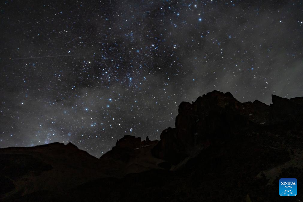 This long exposure photo taken on April 11, 2026 shows a view of the starry sky over Mount Kenya National Park seen from Shipton's Camp in Meru County, central Kenya. Located close to the Equator in central Kenya, Mount Kenya is the second-highest mountain in Africa as its highest peak, Batian, reaches 5,199 meters.