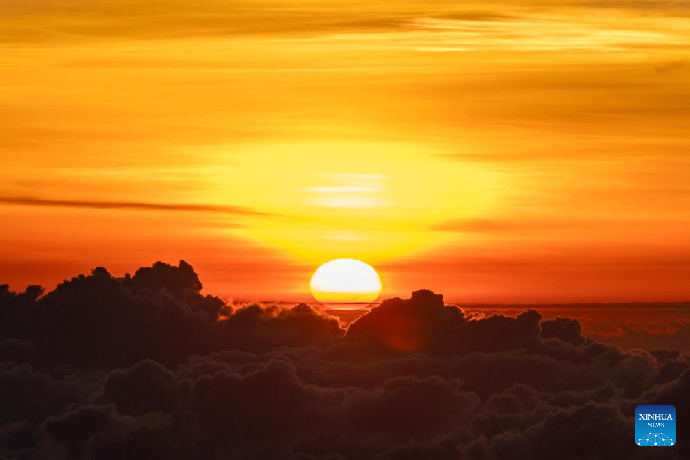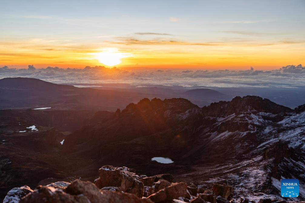 This photo taken on April 12, 2026 shows the sunrise view seen from the summit of Point Lenana in Mount Kenya National Park, Meru County, central Kenya. Located close to the Equator in central Kenya, Mount Kenya is the second-highest mountain in Africa as its highest peak, Batian, reaches 5,199 meters.