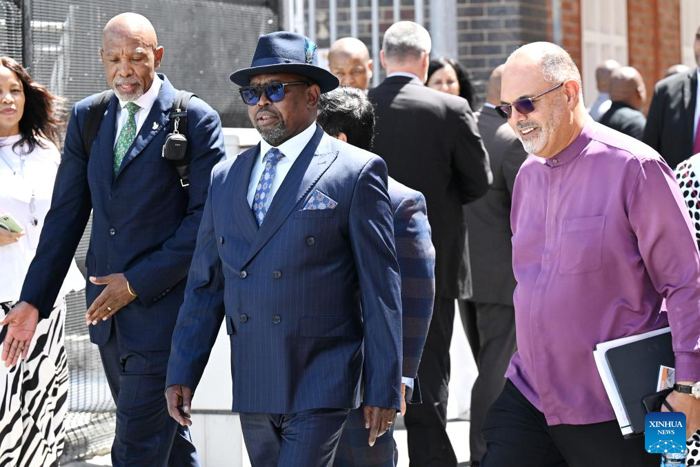 South African Finance Minister Enoch Godongwana (C, front) arrives at the parliament to deliver the 2026 Budget Speech in Cape Town, South Africa, Feb. 25, 2026. Godongwana has not been accredited by the United States to attend the upcoming Group of Twenty (G20) finance chiefs meeting, local media reported on Monday. (Photo by Xabiso Mkhabela/Xinhua)