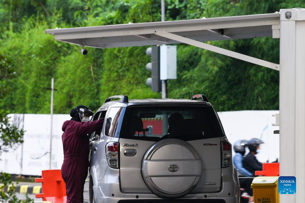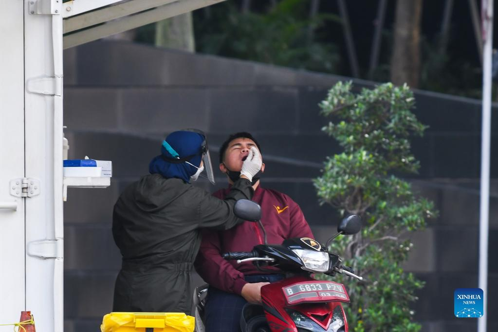 A health worker conducts COVID-19 antigen test for a person at a drive-thru COVID-19 antigen test station in Jakarta, Indonesia, March 28, 2022. Indonesia has registered more than 6 million cases of COVID-19 since the first case was confirmed in the country in March 2020. On Monday, the Health Ministry reported that the coronavirus cases across the archipelago rose by 2,798 within the past 24 hours to 6,001,751 with the death toll adding by 104 to 154,774. (Xinhua/Xu Qin)