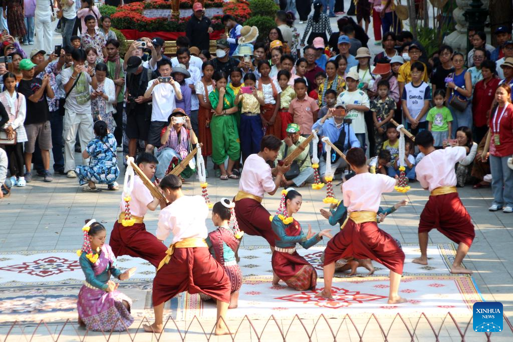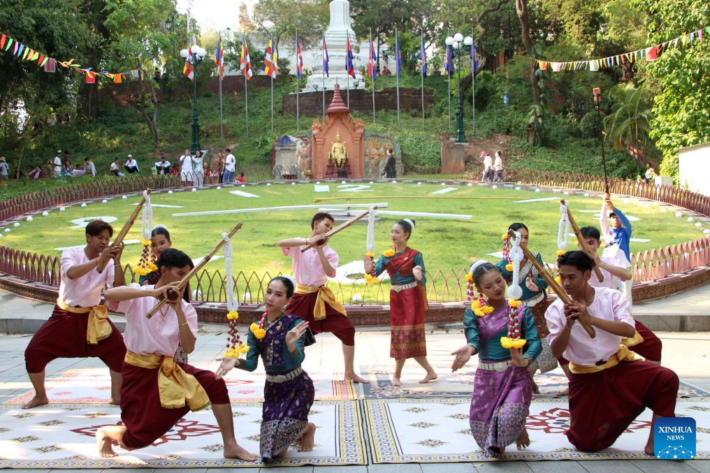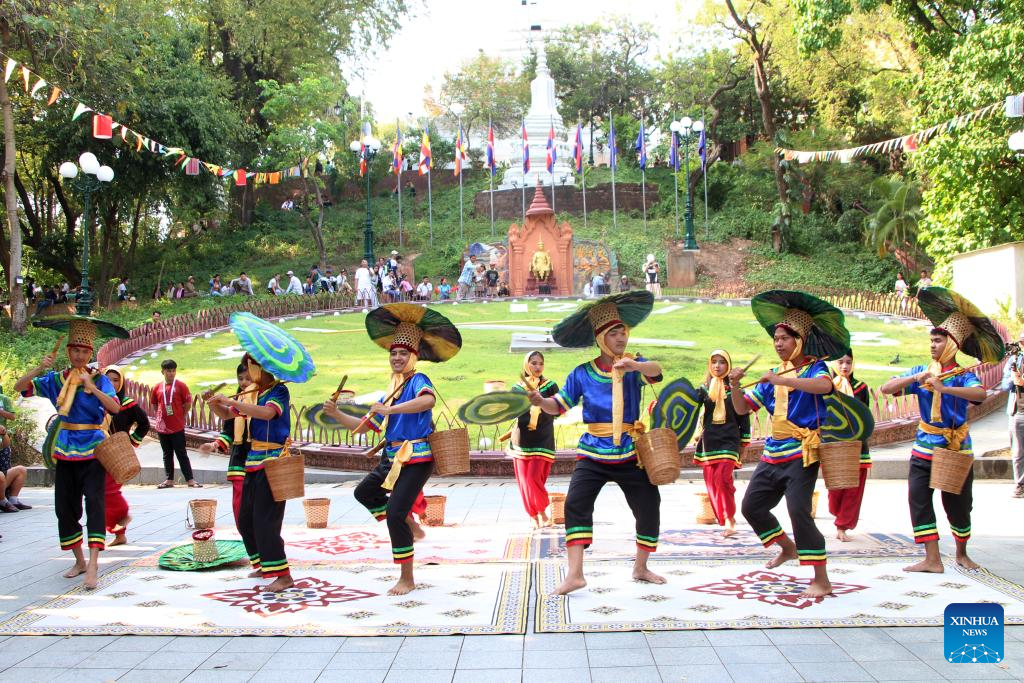 Artists perform during the celebrations of the Cambodian New Year at the Wat Phnom historical site in Phnom Penh, Cambodia on April 14, 2026. (Photo by Sovannara/Xinhua)