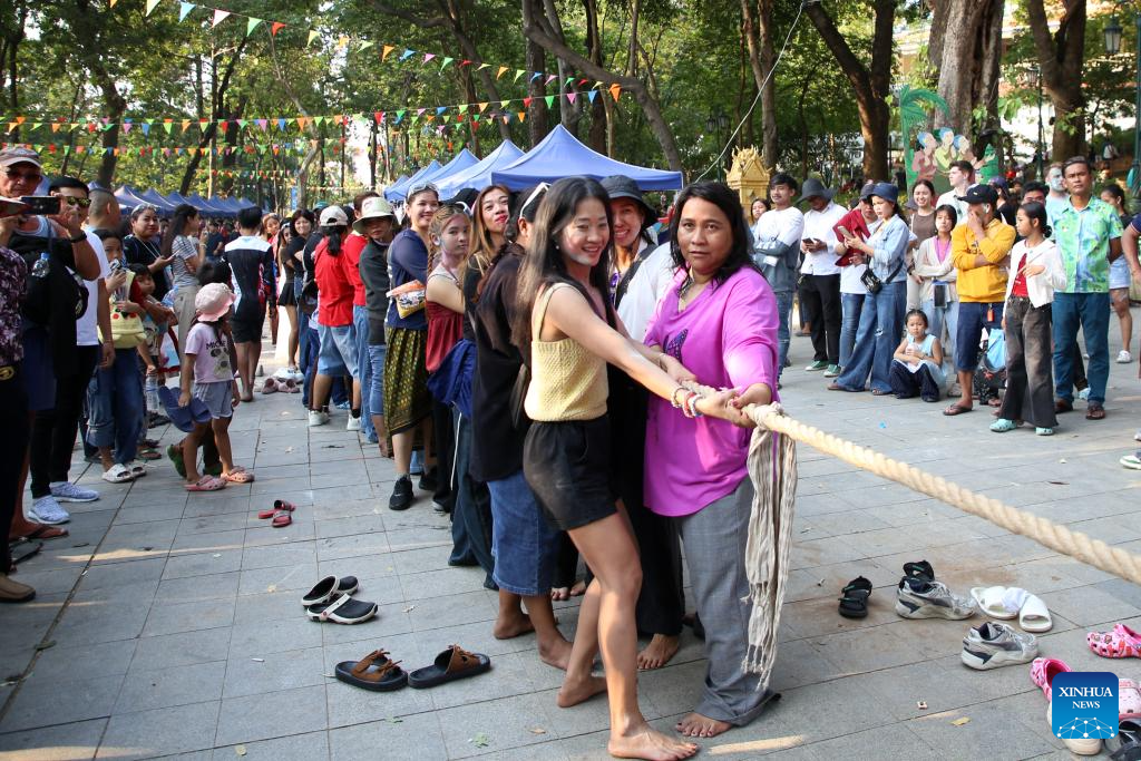 People play tug-of-war game during the celebrations of the Cambodian New Year at the Wat Phnom historical site in Phnom Penh, Cambodia on April 14, 2026. (Photo by Sovannara/Xinhua)