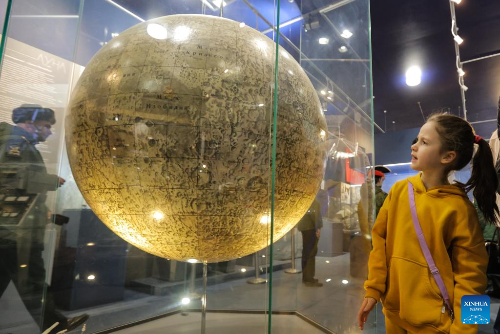 A girl views a model of the moon at the Museum of Space Exploration and Rocket Technology V.P. Glushko in St. Petersburg, Russia, April 12, 2026. St. Petersburg marked Russia's Cosmonautics Day with a series of events, including a concert at the Peter and Paul Fortress and free access to the Museum of Space Exploration and Rocket Technology V.P. Glushko, drawing large crowds of visitors. (Photo by Irina Motina/Xinhua)