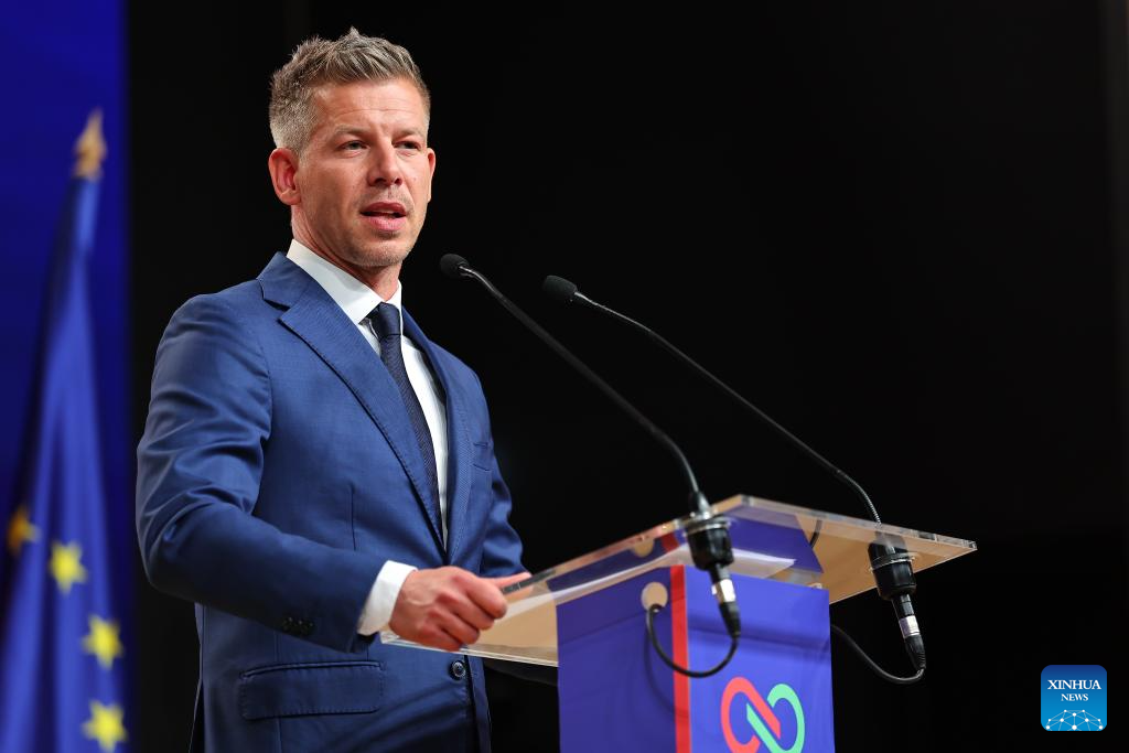 Peter Magyar, leader of Hungary's Tisza Party, attends an international press conference in Budapest, Hungary, April 13, 2026. Hungary's opposition party Tisza, led by Peter Magyar, defeated Prime Minister Viktor Orban's ruling coalition by securing a majority in Sunday's parliamentary elections, according to preliminary results released by the National Election Office (NEO). (Photo by David Balogh/Xinhua)