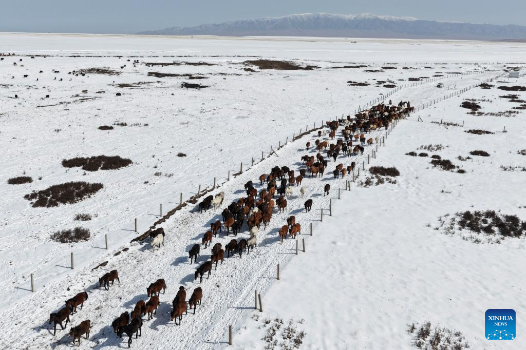 An aerial drone photo taken on April 14, 2026 shows horses of the Shandan Horse Breeding Farm in northwest China's Gansu Province. During plowing season, herdsmen started to guide horse herds from farmlands to natural grasslands. (Photo by Wang Chao/Xinhua)
