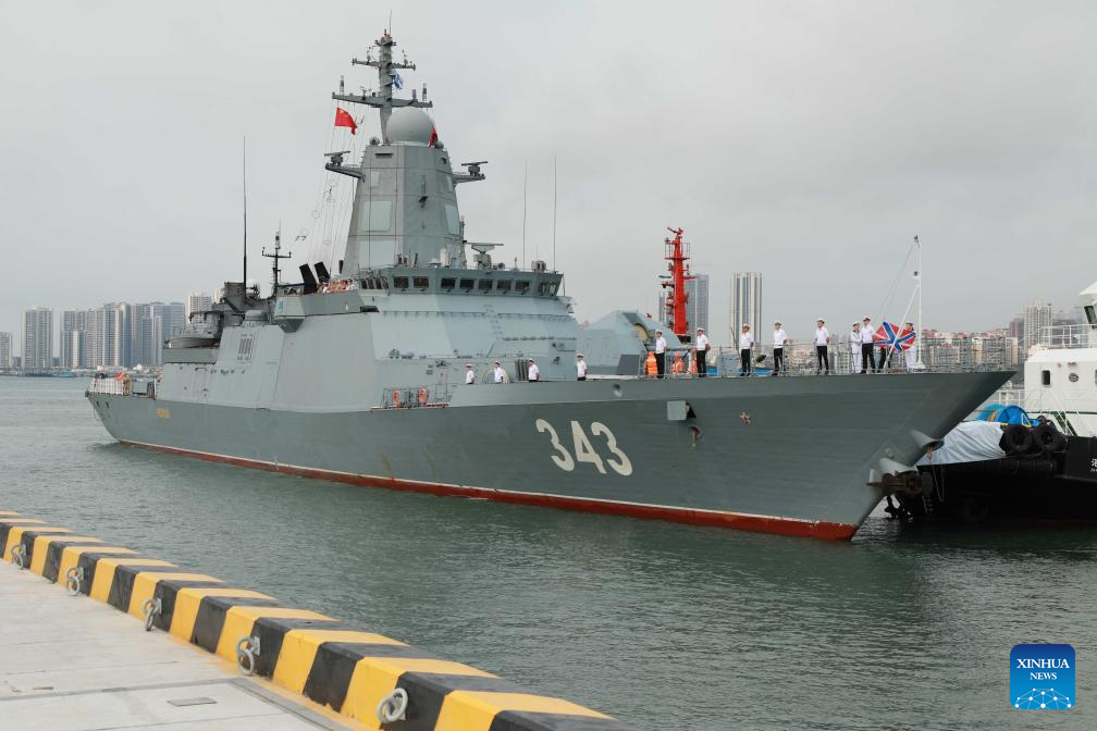 A frigate of a Russian navy fleet arrives at a military port in Zhanjiang, south China's Guangdong Province, April 15, 2026. A Russian navy fleet consisting of two frigates and a medium-sized replenishment ship arrived in south China's Guangdong Province on Wednesday for a five-day friendly visit.