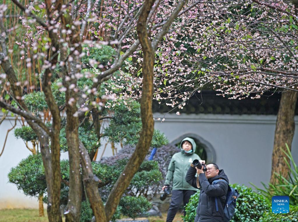 Photo taken on Feb. 13, 2022 shows plum blossoms in Qingxiu Mountain scenic area in Nanning, south China's Guangxi Zhuang Autonomous Region. The Qingxiu Mountain scenic area has attracted many tourists as plum trees are in blossom in early spring. (Xinhua/Zhou Hua)