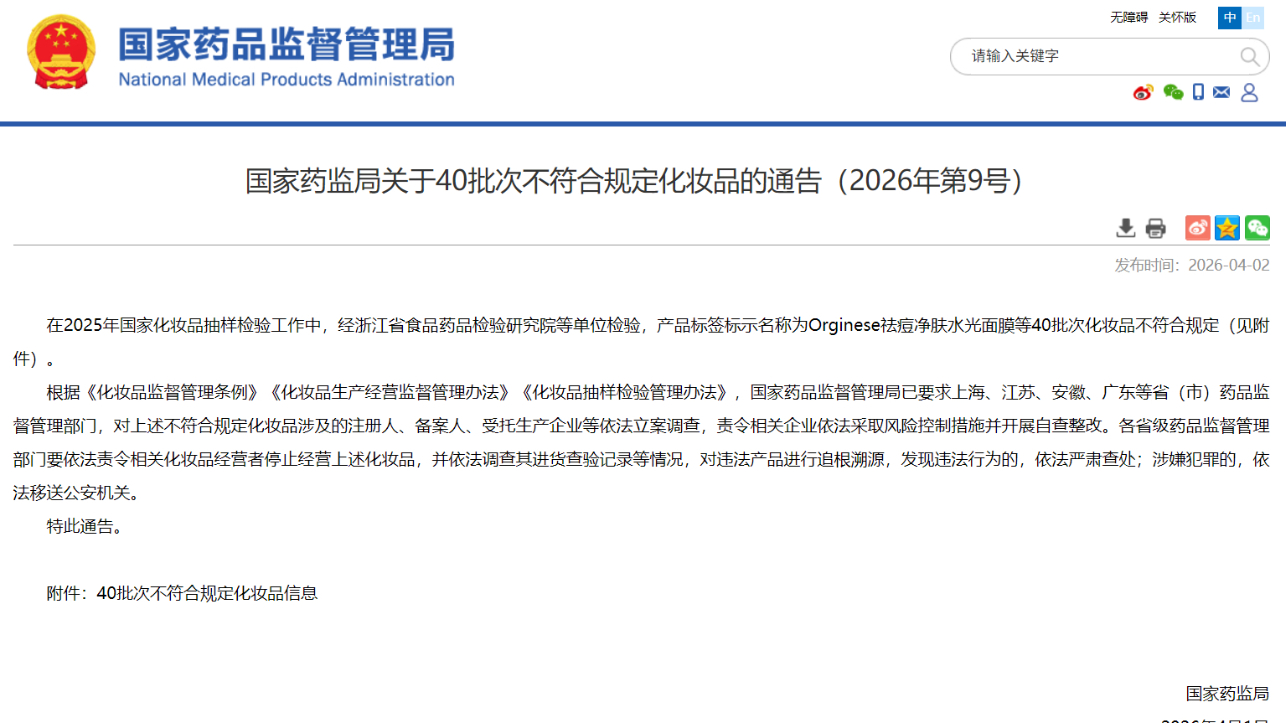 國家藥監(jiān)局關(guān)于40批次不符合規(guī)定化妝品的通告(2026年第9號)
