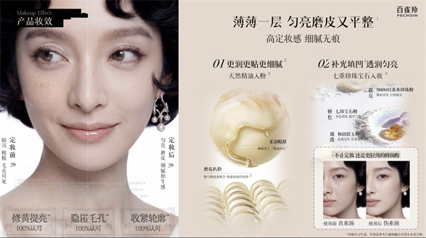 传统蜜粉的痛点在于“干”和“卡”。养肤成分(如精油、提取物)与粉体质感天然矛盾:加了养肤成分容易结块、飞粉;追求粉质细腻又牺牲了滋养效果。为此,百雀羚研发团队首创「精油重力粉」技术,以精油包裹粉体,实现绵软糯的羊绒般触感,上脸不易飞粉,同时达到24小时润感持妆,兼具防蹭、防水、防汗的稳定表现。这一技术突破,让养肤与妆效不再互相妥协。