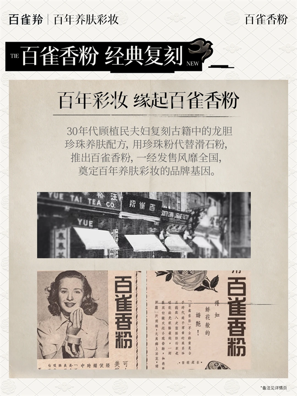 回望历史脉络,百雀羚的彩妆基因并非外向跨界,而是品牌原点。1931年,品牌创始人顾植民先生于上海长乐路创立百雀羚,率先探索出“妆养合一”的东方路径。同年推出“百雀香粉”,复刻自古籍中的“龙胆珍珠养肤配方”,以精油入妆、珍珠养颜,开创了中国养肤彩妆的先河。彼时,这款产品便成为阮玲玉、周璇等民国名伶的钟爱之选。