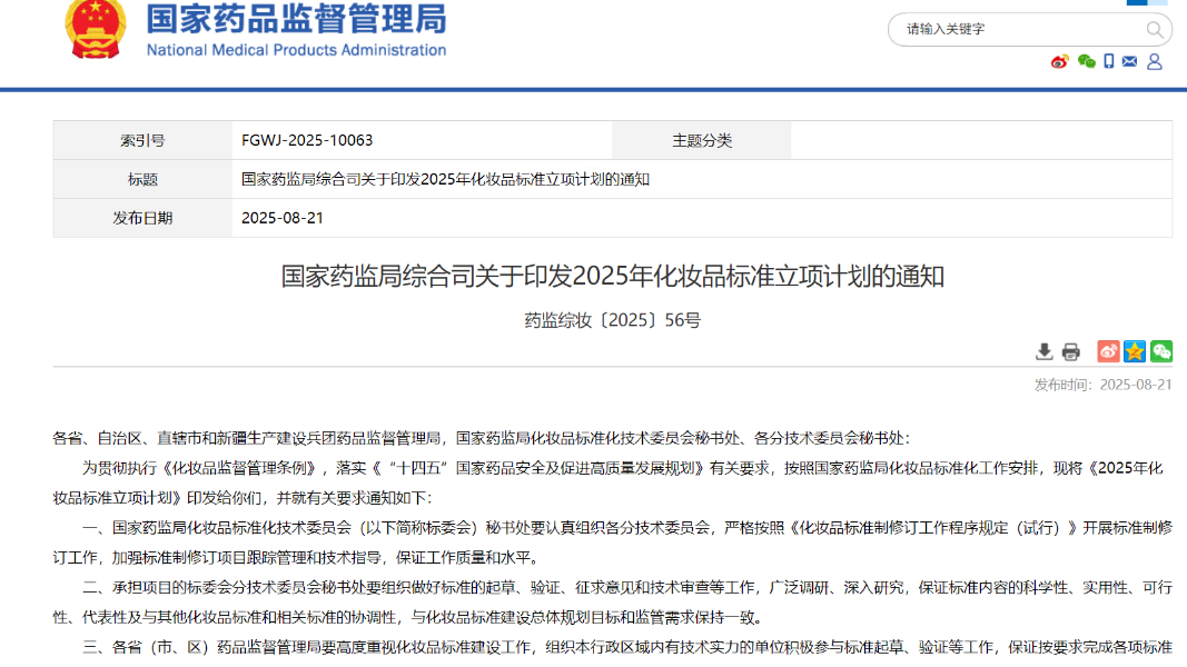 國家藥監(jiān)局綜合司關(guān)于印發(fā)2025年化妝品標準立項計劃的通知