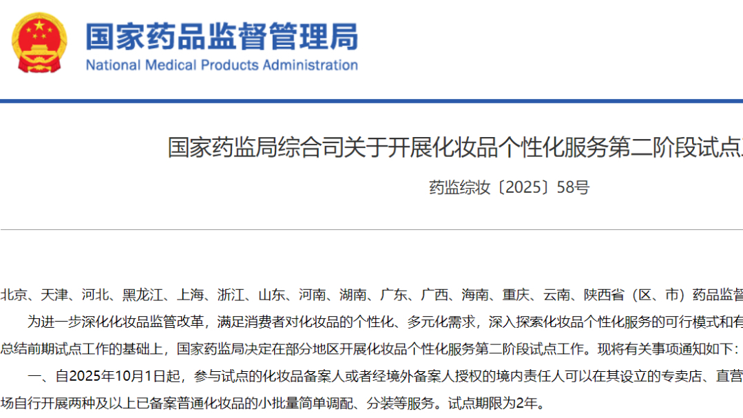 國家藥監(jiān)局綜合司關(guān)于開展化妝品個性化服務第二階段試點工作的通知 藥監(jiān)綜妝〔2025〕58號